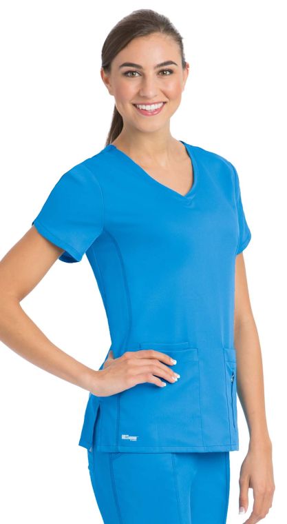 Grey’s Anatomy™ 41423 Active Crossover V-Neck Scrub Top: - Junior fit - V-neck - 4 Pocket - Side panels - Hidden locking zipper pocket detail - Short sleeves - Fitted back - Length = 25.5" at Medium, +/- .25" per Size