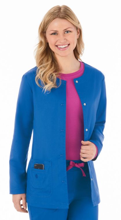 Bio Stretch Women's Everyday Warm-Up Scrub Jacket: - Set-in sleeves - 3 pockets; 2 rounded patch with 1 small welt pocket - 5 snap closure - Fitted Missy fit - 27.0" length *CLEARANCE NO RETURN OR EXCHANGE*