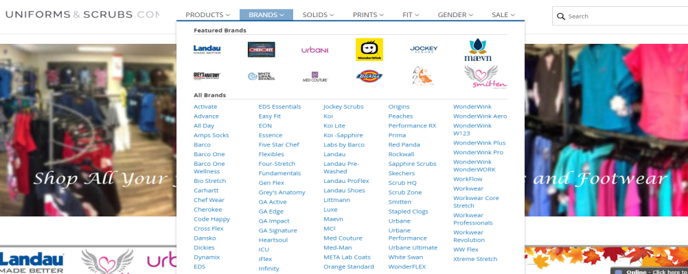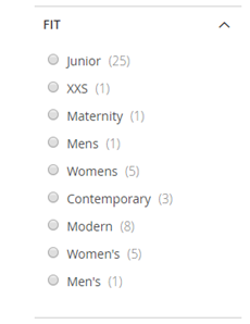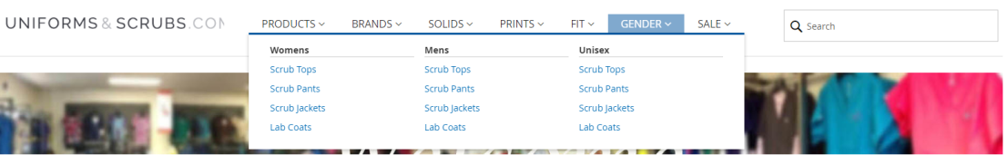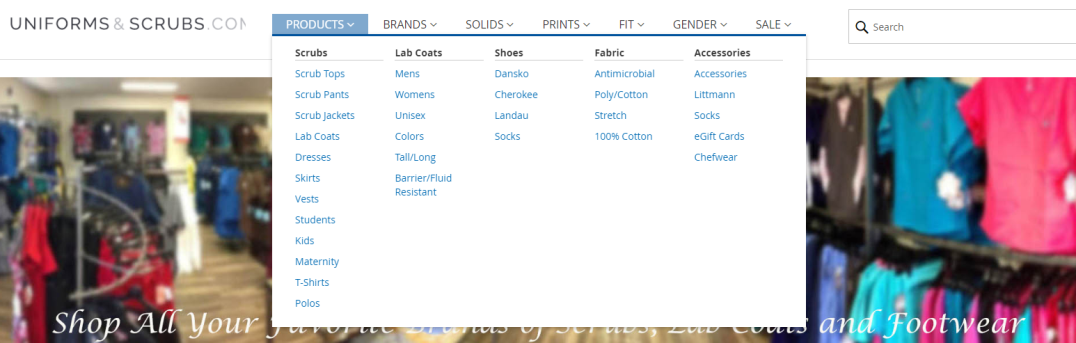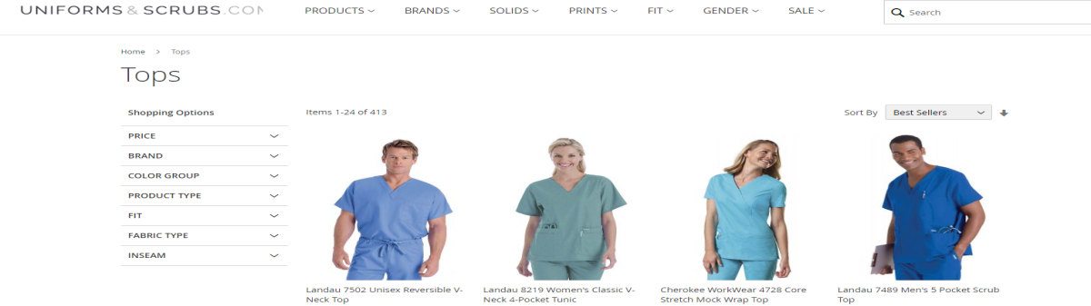 At the beginning of our search example from the home page under products, we selected tops. This gives us 413 options for tops. In the shopping options on the left of the page we then selected the Urbane line; this narrowed our search down to 28 options. We could then narrow the search further by selecting a fit, color or fabric type.