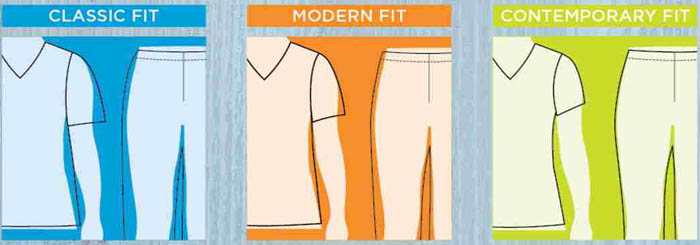 Some of the manufacturers use the terms like CLASSIC, CONTEMPORARY or MODERN to separate their garments. CLASSIC = are generously cut to provide optimal comfort and ease of movement with tops that are fit for comfort and ease with longer and wider sleeves and more room in the body, and pants with higher rise and wider leg opening. MODERN = are tailored to flatter your shape without limiting movement with tops that have a more contoured shape with slimmer sleeves and pants that sit lower on the waist with a shorter rise and narrower leg opening. CONTEMPORARY = contoured to conform to your body with shorter, slimmer sleeves on tops and an overall trimmer fit in tops and pants with a lower rise and snugger leg.