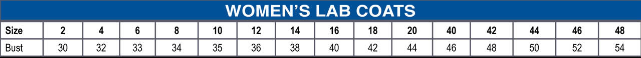 FOR LAB COATS use the chest as your primary measurement like on the tops. Many of the men's lab coats are sized just like a suit coat. Size 38 = a 38" chest measurement. That makes it simple! The ladies coats are either in Alpha sizes like Small, Medium, Large….ect. or they are in Numeric sizes as seen below.