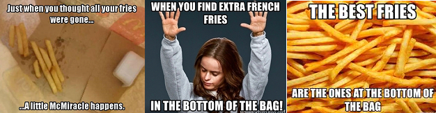 Follow along with me here, and don’t be afraid to admit it, because I’m sure we all do it. I try to limit my fast food consumption, but every once in a while, there is nothing that hits the spot like a burger and fries from my favorite drive through. And let’s be honest; the fries will not make it home. You just gotta eat them when they are piping hot straight from the fryer into your bag. Yep, that’s me, driving down the road happily munching on my fresh, hot, salty fries! I have achieved culinary bliss for one brief moment; only to crash and burn in the heartache of eating the last fry and having none left to go with my burger when I get home. L Oh but wait! There they are! You find them at home when unpacking your burger. The wonderfully unexpected bonus fries in the bottom of the bag!! Don’t you just love that little something extra!
