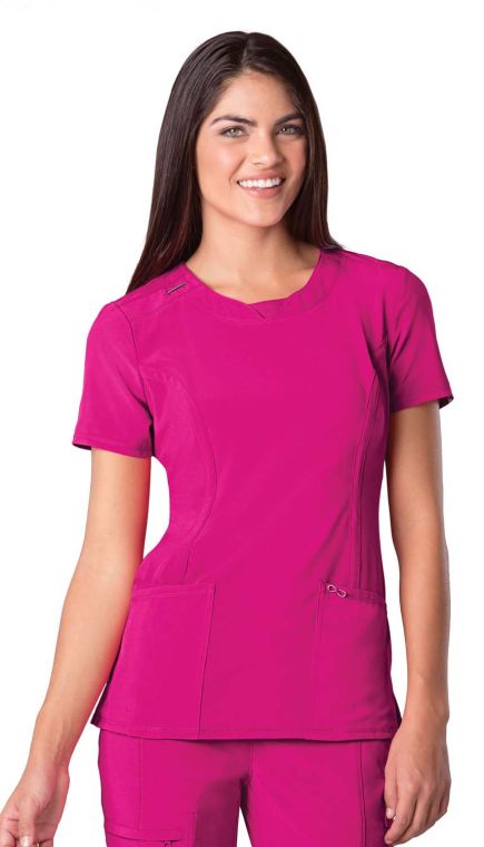 Infinity Certainty® V-Neck Top: - Round neck antimicrobial scrub top - Rib inset front neckband features shoulder yokes, a bungee I.D. badge loop on the right shoulder - Front and back princess seams - Two patch pockets, one interior pocket - Side vents - Stretch rib knit at the center back panel gives this top its slimming shape and allows for extra movement and comfort - Cover-stitch detail throughout - Center back length = 26.0”