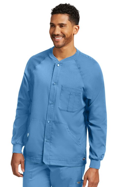 Grey’s Anatomy™ 0406 Men's Warm-Up: - 5 Pocket Raglan warm-up - Rib cuffs and collar - Kangaroo pockets - Open back yoke vent - Snap front - Length = 29.0" at Medium, +/- .25" per Size *CLEARANCE NO RETURN OR EXCHANGE*