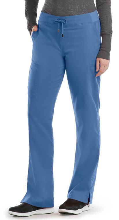 Grey’s Anatomy™ 4277 Yoga Look Pant: - Modern fit - Knit modern-rise waistband - Grommets with tipped tie - Slash pockets, welt cargo pockets, back welt pockets - Zip side pda pocket - Side slits - Leg opening width 9” - Inseams: Regular-31.5", Petite-29.5", Tall-33.5"