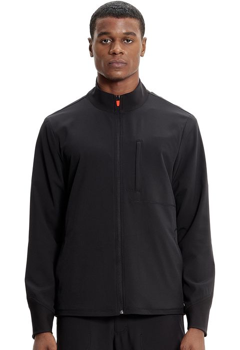 This Men's fit zip front jacket has a dyed-to-match rib-knit stand-up collar, shaped cuffs, and center back panel. There are three pockets for storage: one welt zipper chest pocket and two in-seam pockets with signature contrast mesh pocket bags. Contrast colored soft zipper pulls for easy grip. Other features include a curved back yoke for a better fit across the shoulders. Center back length: 28"