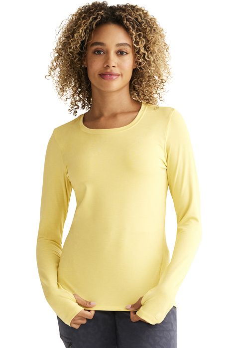This Modern fit long sleeve underscrub tee has a round neck plus stylized front and back seams. Thumbholes at sleeve hems and a shirttail hem complete the look. Length: 26 1/2"./n