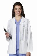 WonderLab Women's 38.0" Long Lab Coat: - Modern Women's fit - Chest pocket - Pen slot - Large front pockets - Side access - White logo embroidery at pocket - Inner iPad/tablet pocket - Locker loop - Side vents - Center back length = 38.0"